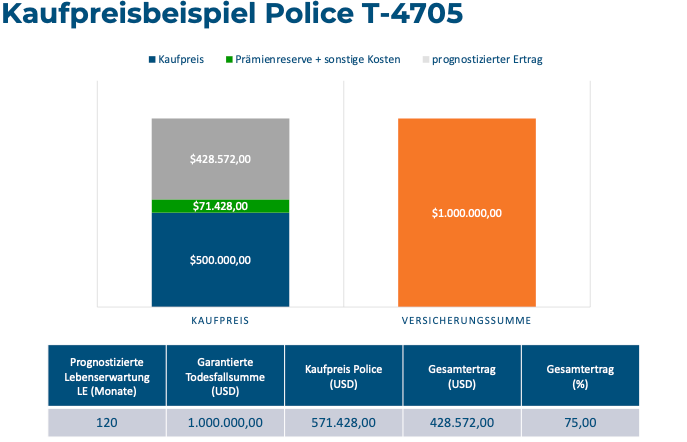 Der Käufer übernimmt die Prämienzahlungen und erhält im Versicherungsfall die garantierte Versicherungssumme von 1.000.000 USD. Die Rendite ergibt sich aus der Differenz zwischen Kaufpreis, laufenden Kosten und der späteren Auszahlung.